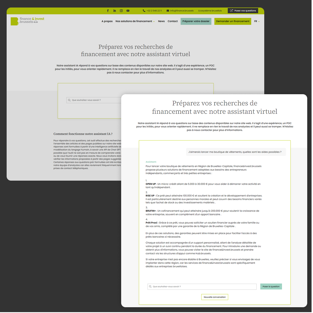 À cela s’ajoute un assistant virtuel intelligent, disponible 24/7, qui guide les entrepreneurs dans leurs démarches de financement. Grâce à l’IA, l'assistant répond aux questions fréquentes et oriente le visiteur vers les solutions adaptées.